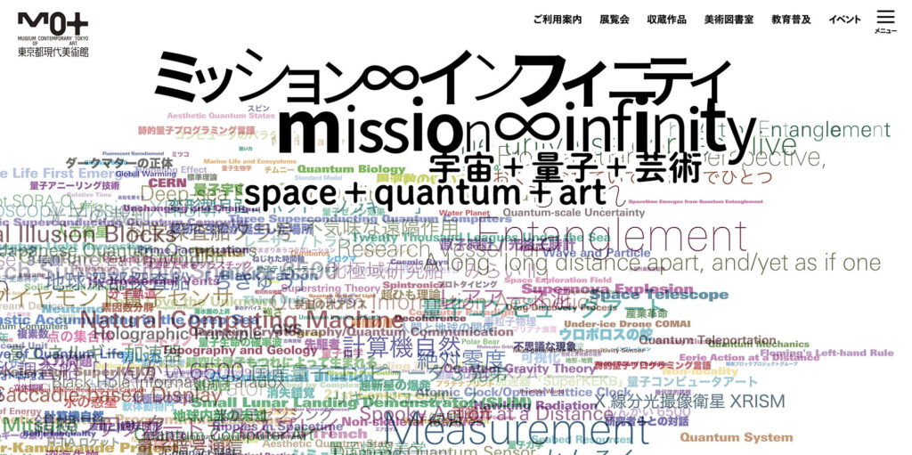 東京都現代美術館で開催中の「ミッション∞インフィニティ|宇宙+量子+芸術」展の後期展示として、4月1日から私の写真作品が展示されています。展示室内の横幅約9mの大型スクリーンに、十数点の写真が約2分のスライドショーという形での上映です。ただ、多数の作品がループ上映されている中の1点ですので、1サイクル見終わるまでに約40分かかります。お時間に余裕を持ってお出かけください。なお、会期は5月6日(水)までです。
